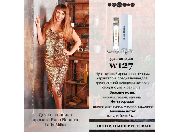 W127 эквивалент - для любителей аромата Пако Рабан Леди Миллион. Аромат: Цветочный, Фруктовый