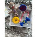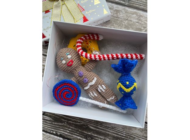 В набор входит 5 игрушек: пряничный человечек, два леденца разных форм, пончик и конфета. Игрушки уже упакованы в красивую коробочку, вам остаётся только подарить.