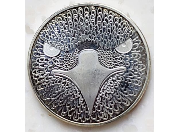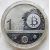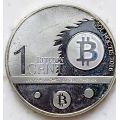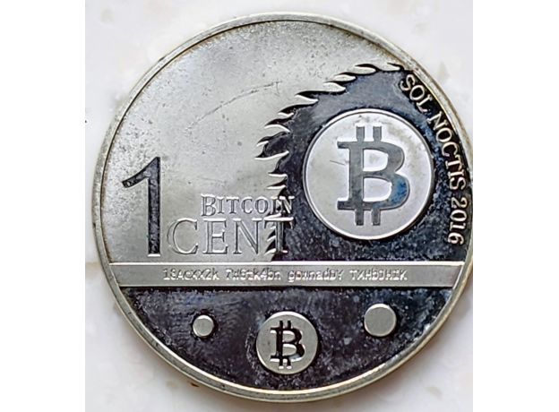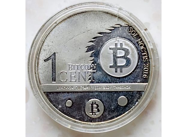 Сувенирная монета номиналом один биткоин цент. Белый металл. Возможно драгоценный, но на зуб не пробовал. Оригинальный подарок для фанатов криптовалты.