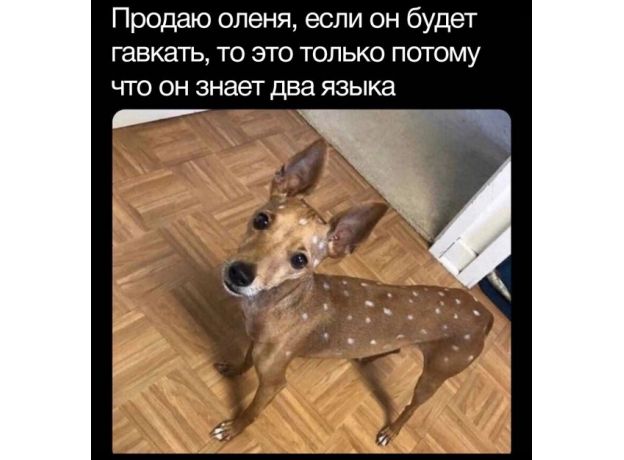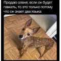 Олень собаковидный. Продаю, потому что не переношу второго языка, на котором он постоянно говорит. При том ещё ругаются соседи и зовут участкового. Устал уже платить штрафы за шум! Но может быть кто-то любит музыку собачьего лая, так этот олень для вас!