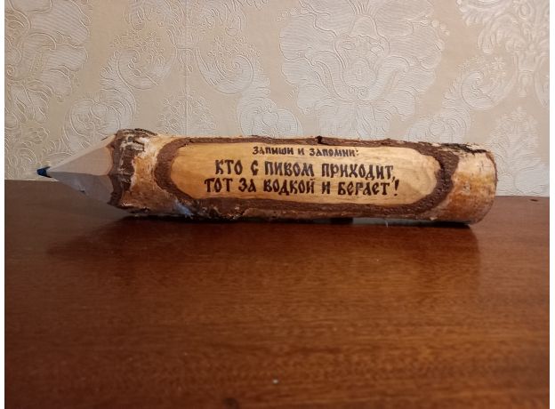 Сувенир в форме карандаша станет беспроигрышным вариантом. Данный слоган на карандаше вызовет улыбку и поднимет настроение обладателю этого сувенира. Карандаш выполнен из берёзы. Карандаш — это такая чудесная вещь, которая пишет в космосе, на морозе, в условиях высокой влажности и даже вверх ногами.