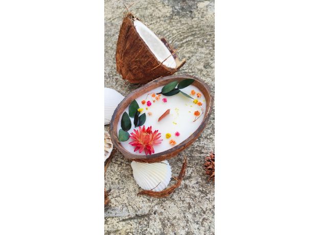 Интерьерная ароматическая свеча в кокосе из натурального кокосового воска с деревянным фитилем