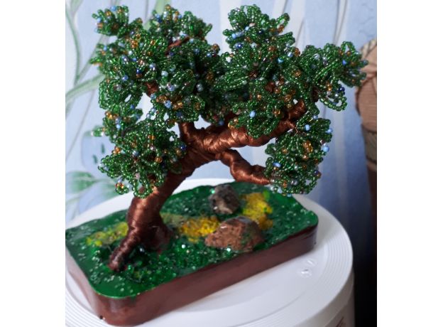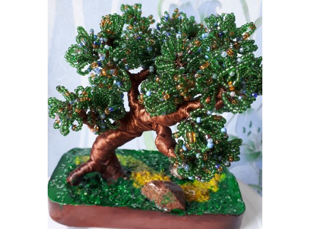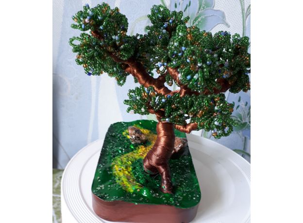 Если у вашей подруги, сестры или просто знакомой день рождения, новоселье или семейное торжество, а вы не знаете что подарить, обратите внимание на чудесное дерево из разноцветного бисера. Дерево выполнено в стиле бонсай из цветных бисерин, атласной ленты, насыщенного коричневого цвета, проволоки, клея и лака. Ветки дерева причудливо изогнуты и имеют подвижность. Их можно регулировать как по высоте, так и по ширине изделия. Оно послужит украшением и будет шикарно смотреться на любой полке, стеллаже или простой поверхности. Пыль и грязь не грозят запачкать ствол и ветки дерева, т.к. его можно мыть теплой водой с моющим средством. После, достаточно ополоснуть дерево под душем и немного стряхнуть с него капли воды. При правильном уходе бонсай долго будет радовать вас своим волшебным блеском и красотой.