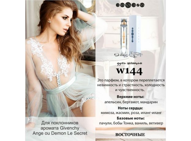 W144 эквивалент - для любителей аромата Живанши ангел и Демон. Верхние ноты: апельсин, бергамот, мандарин Ноты сердца: мимоза, жасмин, роза, иланг-иланг Базовые ноты: пачули, бобы Тонка, ваниль, ветивер Аромат: Восточный страна производства: Чешская Республика 50 мл.
