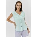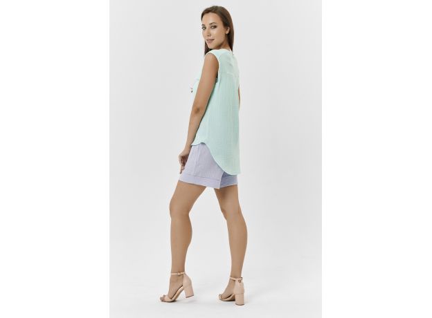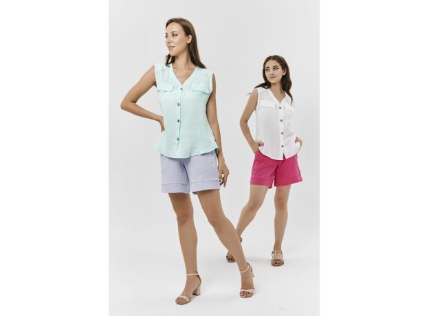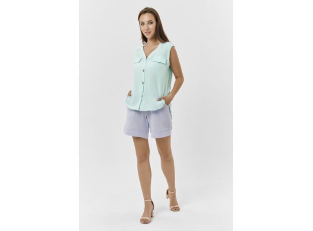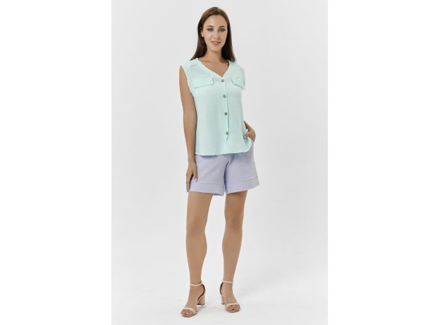 Женская туника-майка на пуговицах, без рукавов, свободная, с удлиненной спинкой и фигурной линией низа. По шву соединения кокеток с полочкой расположены декоративные клапаны. Спинка с кокеткой и складкой. Горловина спинки и проймы обработаны бейкой из основного полотна.