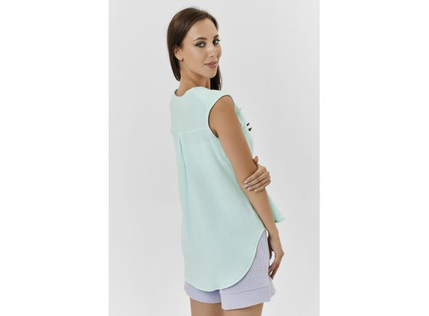 Женская туника-майка на пуговицах, без рукавов, свободная, с удлиненной спинкой и фигурной линией низа. По шву соединения кокеток с полочкой расположены декоративные клапаны. Спинка с кокеткой и складкой. Горловина спинки и проймы обработаны бейкой из основного полотна.