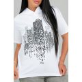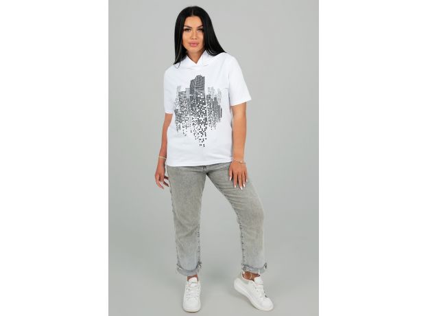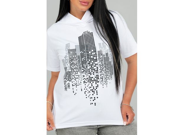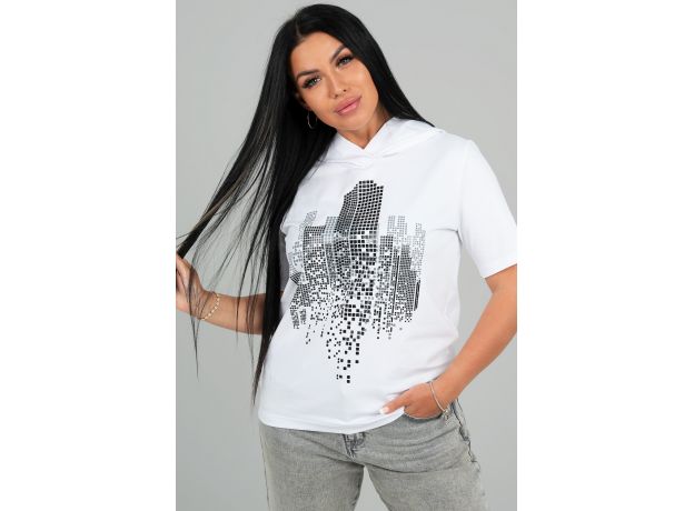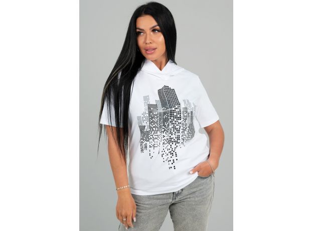 Стильная женская однотонная футболка с принтом из кулирки с лайкрой. Футболка прямого кроя, с коротким рукавом и капюшоном подойдёт под любой современный образ.
