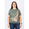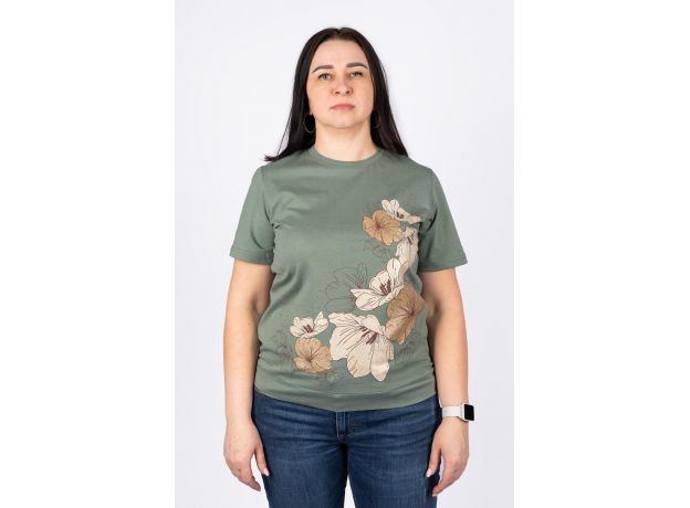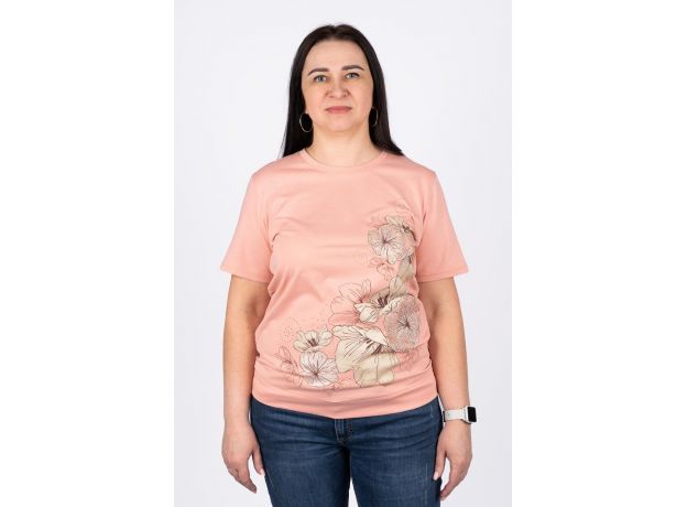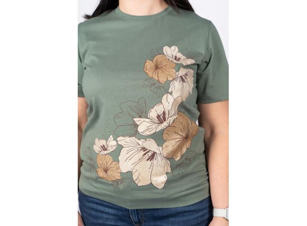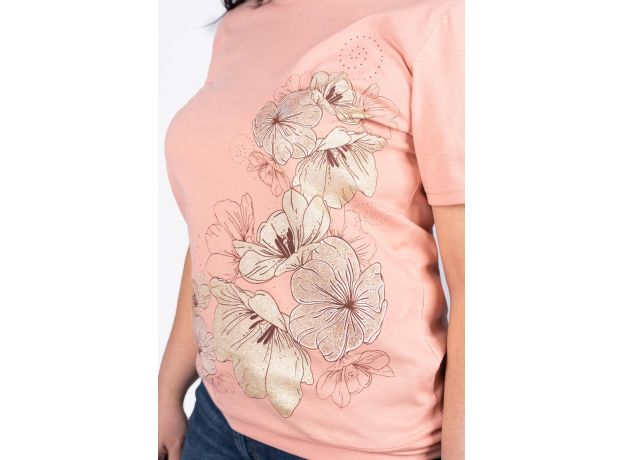 Очень нежная и стильная футболка, усыпанная принтом из цветов, выгодно подчеркнет женственность и фигуру ее обладательницы. Необычный крой с манжетом по низу изделия смотрится необычно, смело, тем не менее органично и красиво. Идеально сочетать с юбками, женственными брюками. Выполнена из хлопкового трикотажа. Мягкий материал пропускает воздух, позволяет коже дышать, не вызывает раздражения и аллергии. Горловина круглая, обработана воротником из кулирки. Низ рукавов обработан швом вподгибку. На полочке принт шелкография с глиттером.