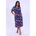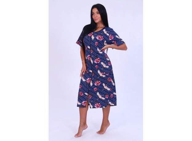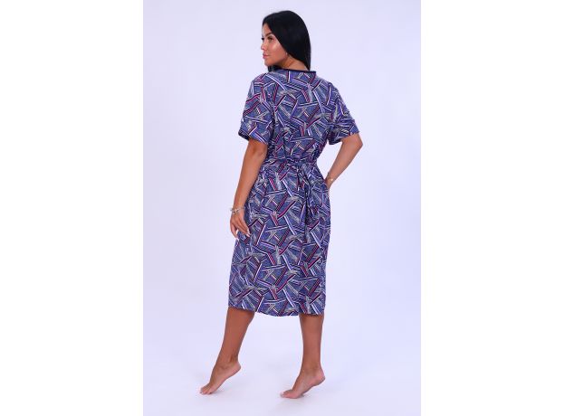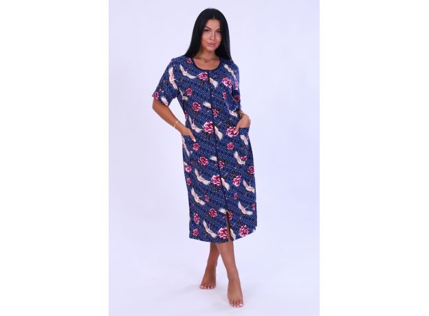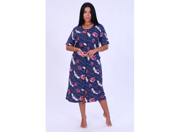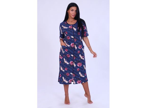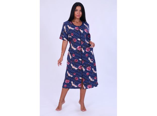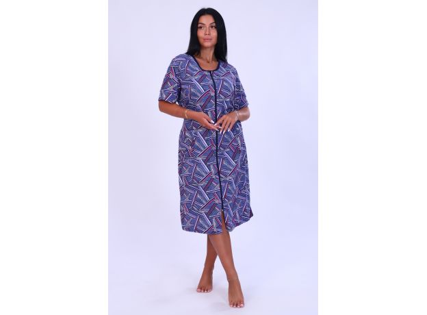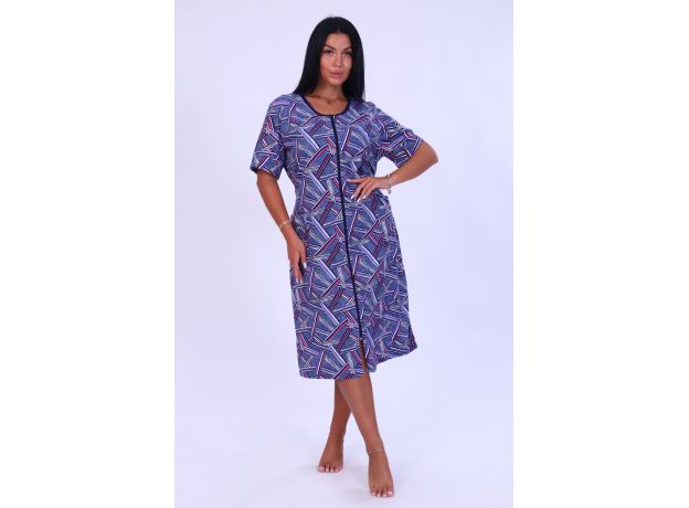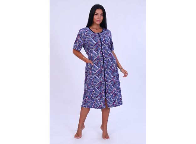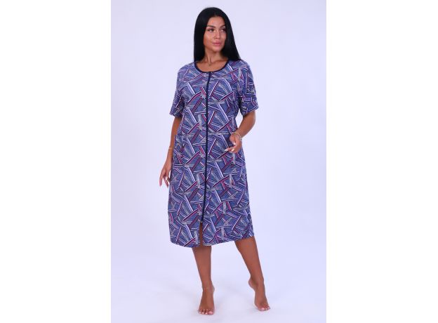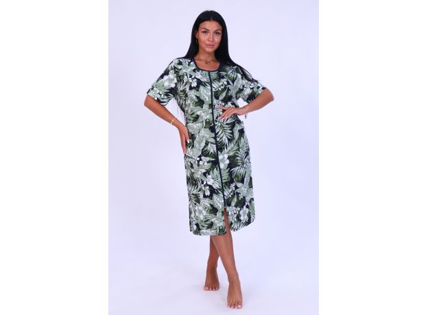 Халат женский с центральной застежкой на молнию. Рукава короткие на манжетах. Вырез горловины круглый обработан кантом. На полочках накладные карманы. На спинке по линии талии два полупояса, выходящие из боковых швов.