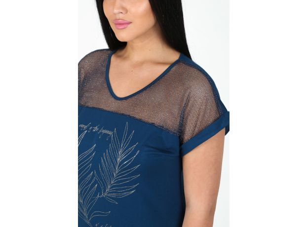 Модель свободного силуэта со спущенным рукавом на манжете длиной ниже линии бёдер. Передняя часть украшена мягкой сеткой с люрексом, по центру нанесена стильная современная печать. Туника прекрасно сочетается с джинсами, бриджами, юбками, брюками, в ней Вы всегда и везде будете выглядеть эффектно и неотразимо