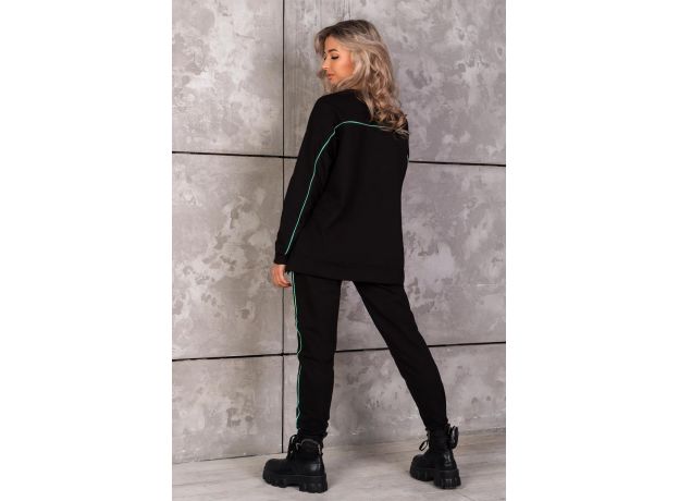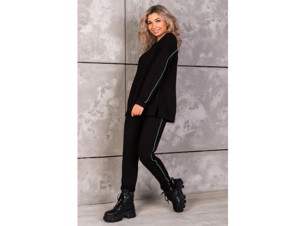 Костюм женский молодежный, состоит из толстовки и брюк. Толстовка объема оверсайз, длиной ниже линии бедер. Плечо спущенное, рукав длинный втачной с манжетой из кашкорсе. Горловина округлой формы с обтачной с обтачкой из кашкорсе. Спинка с кокеткой, переходящим швом на рукав. В шов вставлен кант контрастного цвета, цвет канта белый, ментол. Боковой шов переведен на перед. В швах внутренние боковые карманы. Низ толстовки с притачным поясом и боковыми разрезами. Брюки длинные, слегка зауженные к низу, с контрастным кантом по боковому шву. Пояс притачной, с резинкой и декоративными строчками. Боковые внутренние карманы с наклонным входом.