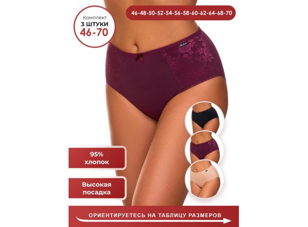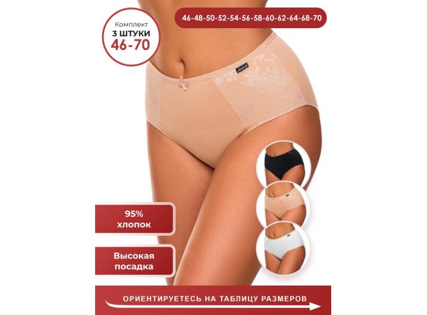 У трусов большой размерный ряд 46-48 до 70-72 и каждая женщина может подобрать себе нижнее белье по размеру. Трусы позволят сделать вашу фигуру более подтянутой, а так же украсят ваш образ в брюках и платье. Именно поэтому для более плотной посадки рекомендуем брать на размер меньше. Модель не видна под одеждой. Мы позаботились о вас и представили корректирующее белье в наборах, которые очень приятны к коже благодаря натуральному хлопку 95% и эластану 5% в составе. Трусики представлены в разнообразных цветовых наборах по три штуки, которые подойдут каждой по вкусу. Поможем подобрать комплект трусов слипов именно под Вас. Рекомендуем деликатную машинную стирку при 30 градусах.