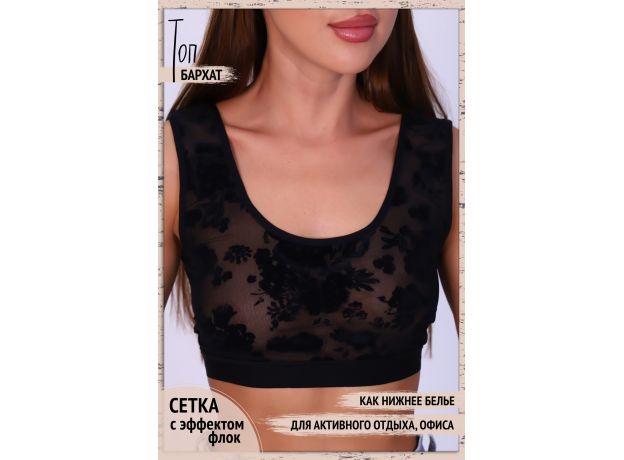 Топы в сетку - это тренд, а также воистину универсальная вещь! Они отлично комбинируются с любыми предметами гардероба: джинсы, юбки, брюки, шорты, нижнее белье, лосины, и т. д. Бархатный принт (флок) выделит Вас и сделает образ незабываемым. Добавьте небольшие яркие акценты в макияже и получите невероятно чувственный и женственный образ для фотосессии. А еще наш топ незаменимый спутник в отпуске на море. Мягкая полупрозрачная сетчатая фактура топа позволяет легко пропускать воздух, делая ее комфортной и невесомой. Данный топ станет отличным подарком к любому событию и празднику: день рождения, Новый год, выпускной, 8 марта, 14 февраля, любимой жене, маме, дочке, подруге. Порадуйте себя и своих любимых и наш топ несомненно займет достойное место в гардеробе и сердце Вашего близкого человека. Короткий бра подойдет на занятия: фитнес, йога, бег, танцы или как домашняя одежда, а так же под футболку, вязаный джемпер, беременным и для кормления, в качестве нижнего белья с кружевными трусиками. Добавьте бюстье в нарядный вечерний образ - костюм с корсетом, под прозрачную кофту со стразами. Отлично смотрится под пиджак, длинную рубашку из хлопка в офис, школу, под блузку с завязками оверсайз и шортами или с юбкой на пляж и даже под шелковый, атласный халат.