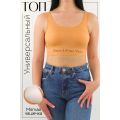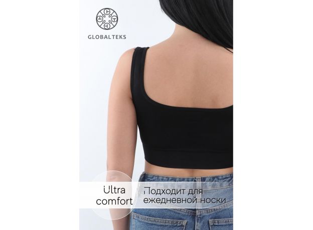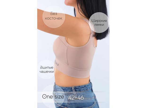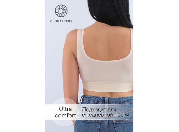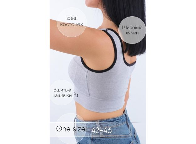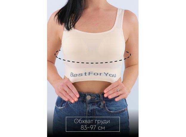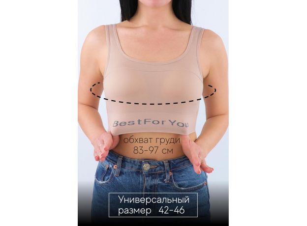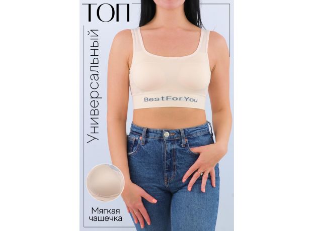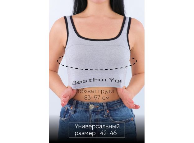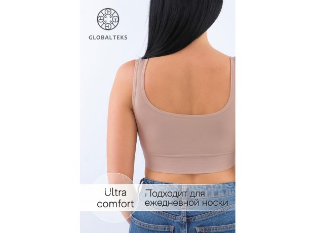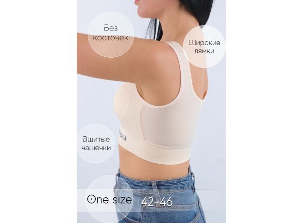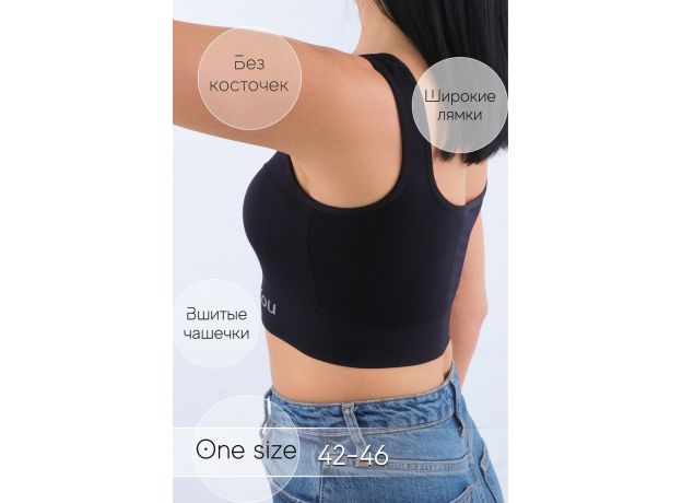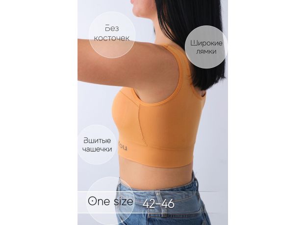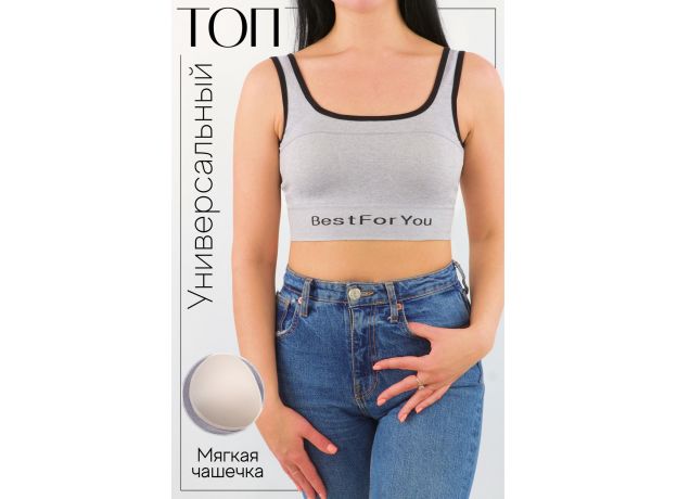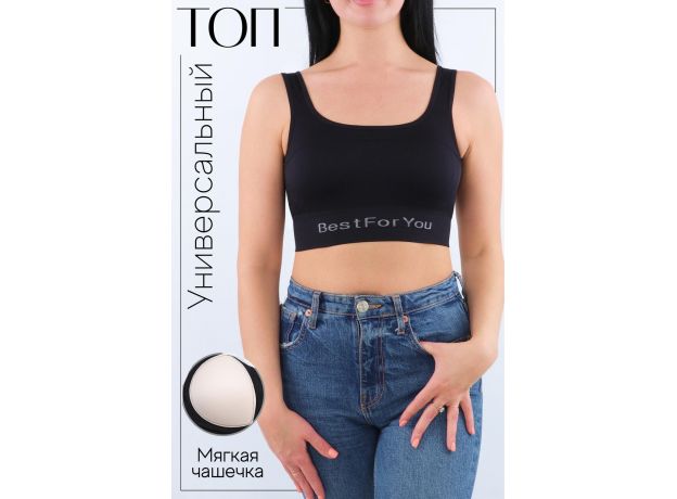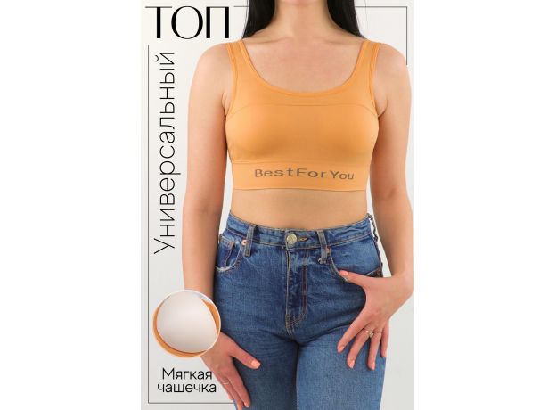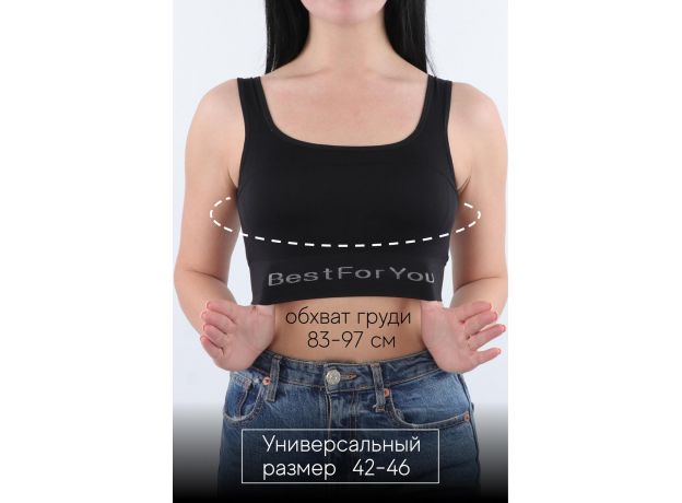 Мягко облегающий грудь топ на широких лямках. Однотонный топ с поддержкой сшит из эластичного, но плотного материала (полиэстер, спандекс). Тонкий, но плотный материал не просвечивает, мягкие лямки не натирают и не спускаются, изделие не сковывает движений.