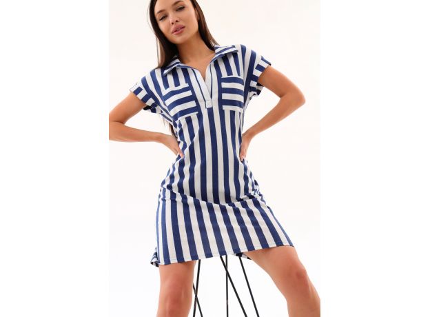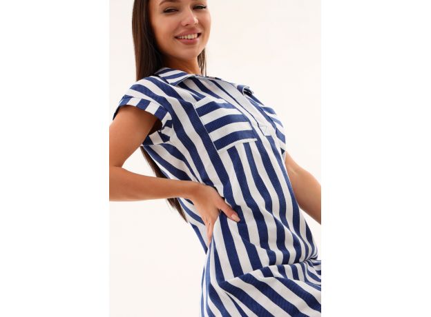 Moses. Туника женская трикотажная хлопок длиной до колена, со спущенной проймой на манжете и застежкой поло. Благодаря оптимальной длине и свободному крою в этой тунике будет комфортно и удобно в течение дня. На груди имеются два накладных кармана. Расцветка туники бело синея  полоса, полосатый рисунок актуален и прекрасно подходит всем.  Платье могут носить девушки любого роста, возраста и с любым типом фигуры - худые и полные, взрослые и подростки. Порадуйте себя осенью новым домашним платьем!