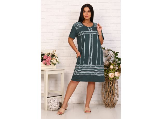Туника из кулирного полотна, прямой силуэт, горловина круглая, рукав короткий, втачной, в боковых швах карманы, низ изделия обработан на плоскошовной машине, на полочке принт.