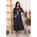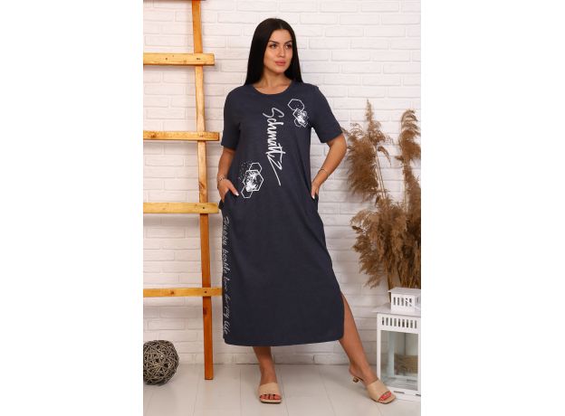 Туника женская из кулирного полотна, прямой силуэт, горловина круглая, рукав короткий, втачной, в боковых швах внутренние карманы, сбоку разрез, низ изделия обработан на плоскошовной машине, на полочке принт.
