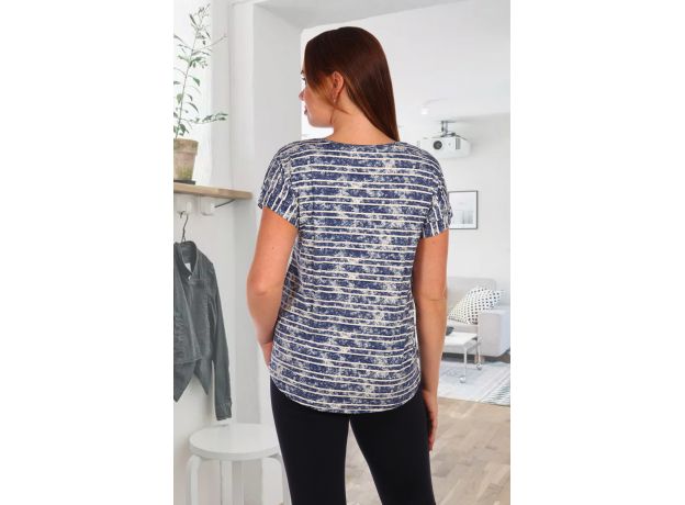 Туника прямого силуэта, с округлой горловиной, с ассиметричным низом, длиной до середины бедра. Рукав цельнокроенный, короткий, с манжетом. Боковые швы фигурно смещены на полочку. В нижней части полочки расположена вставка со шнурами-стяжками. Горловина обработана бейкой из основного полотна
