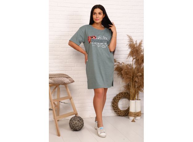 Туника женская свободного силуэта со спущенным плечом, с коротким рукавом. Горловина изделия округлой формы, обработана стойкой. На полочке принт. В боковых швах разрезы. Низ изделия и рукавов подогнут.