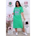 Туника женская из трикотажного полотна модного оттенка, свободного силуэта. Полочка с ярким, стильным принтом, в боковых швах, обработаны разрезы. Рукав втачной, короткий. Горловина округлой формы, обработана обтачкой. Низ изделия и рукавов подогнут.