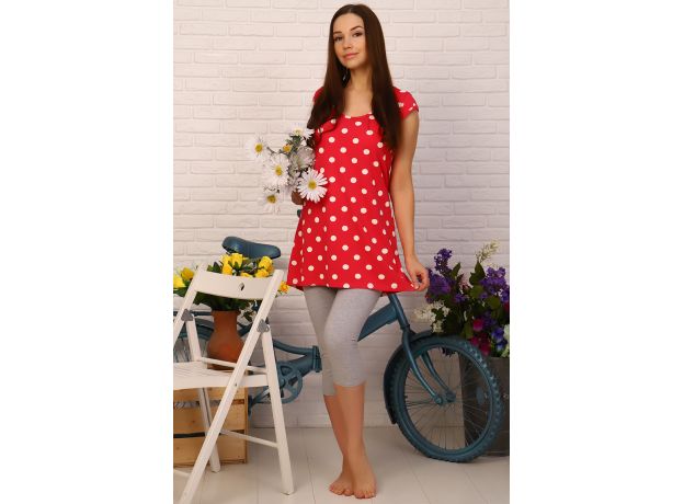 Туника женская с втачным коротким рукавом. Данная модель выполнена из эластичного трикотажного полотна кулирка с лайкрой. Горловина обработана окантовкой. Полочка чуть короче спинки. Спинка отрезная со встречной складкой, низ изделия округлый. Отлично смотрится с лосинами. В летнее время она порадует вас своим свободным силуэтом, легкостью и эластичностью.