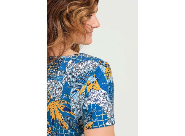 Туника женская приталенного силуэта. Горловина обработана кантом из основной ткани. Низ углообразный. Легкое, свободное. Прекрасно подходит для отдыха и дома. Привлекательный силуэт придаст вам шарм. Карманы боковые