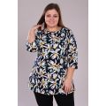 Женская туника приталенного кроя с рельефами, длиной до середины бедра. Рукав 3/4. Округлая горловина украшена изящным вырезом на мысик, обработанным обтачкой.