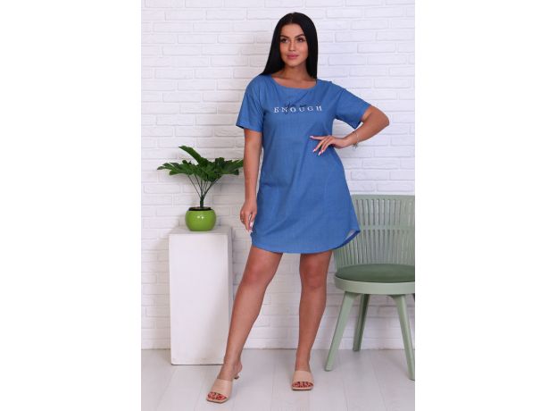 Удобная женская туника из кулирного полотна. Рисунок на ткани имитирует текстуру облегченной джинсы. Округлая горловина и боковые карманы обработаны под окантовку и отстрочены, что придает изделию стильный вид. Туника украшена принтом с лаконичным текстом. Короткий рукав и полукруглый подол изделия обработаны на плоскошовной машине. Крой туники полуприлегающий А-образного силуэта. Данное изделие отлично подойдет для дома и дачи, выручит на отдыхе.