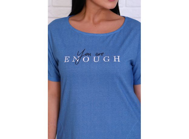 Удобная женская туника из кулирного полотна. Рисунок на ткани имитирует текстуру облегченной джинсы. Округлая горловина и боковые карманы обработаны под окантовку и отстрочены, что придает изделию стильный вид. Туника украшена принтом с лаконичным текстом. Короткий рукав и полукруглый подол изделия обработаны на плоскошовной машине. Крой туники полуприлегающий А-образного силуэта. Данное изделие отлично подойдет для дома и дачи, выручит на отдыхе.