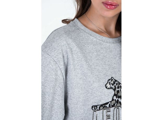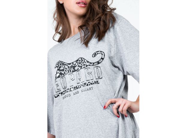 Платье-туника оверсайз с широкими рукавами. Горловина округлой формы обработана качественной рибаной с лайкрой, поэтому после стирки не растягивается. Оригинальный принт на полочке в виде стилизованного леопарда привлекателен именно в своей простоте. Фасон подходит для всех типов фигуры. Принт с серебряным глиттером. Длина рукава указана от основания шеи.