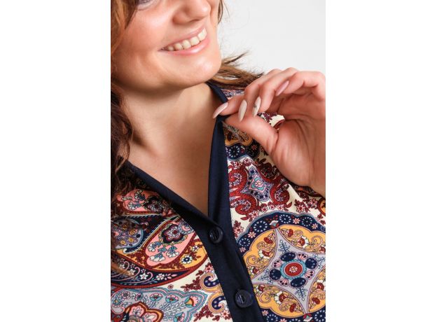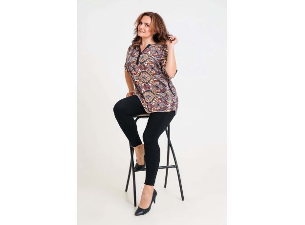 Туника выполнена из комфортной, приятной к телу ткани. Благодаря свободному фасону рубашечного кроя она не обтягивает вашу фигуру. Красивая застёжка-поло. Низ изделия слегка закруглён к боковым срезам