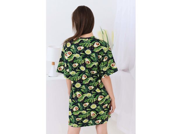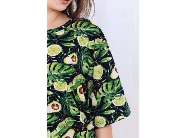 Платье-туника свободного кроя с широкими рукавами. На ткани изображены фрукты-авокадо, которые создадут позитивное настроение и вызовут улыбку у окружающих. Фасон подходит для всех типов фигуры. Горловина округлой формы обработана втачной планкой. Длина рукава указана от основания шеи.