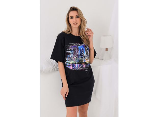 Платье-туника свободного кроя с широкими рукавами. Фасон подходит для всех типов фигуры. Горловина округлой формы обработана втачной планкой. Длина рукава указана от основания шеи. Принт изображает панораму небоскрёбов Москва-Сити.