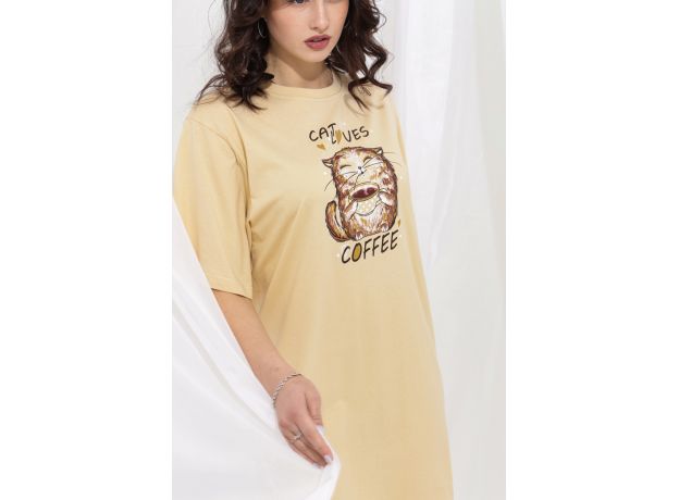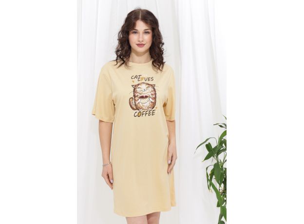 Туника свободного кроя с широкими рукавами. Фасон подходит для всех типов фигуры. Горловина округлой формы обработана втачной планкой. Длина рукава указана от основания шеи. Эта туника может использоваться в качестве ночной сорочки. Оригинальный принт-весёлый добрый кот.