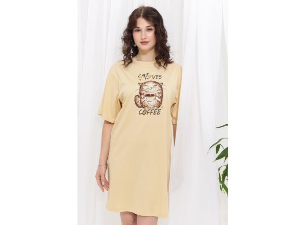 Туника свободного кроя с широкими рукавами. Фасон подходит для всех типов фигуры. Горловина округлой формы обработана втачной планкой. Длина рукава указана от основания шеи. Эта туника может использоваться в качестве ночной сорочки. Оригинальный принт-весёлый добрый кот.