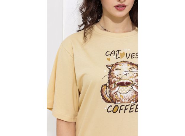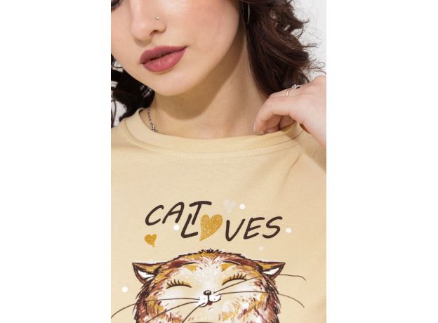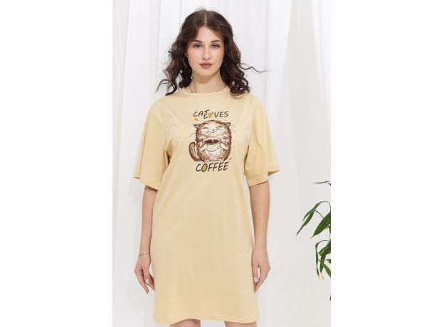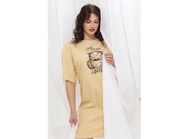 Туника свободного кроя с широкими рукавами. Фасон подходит для всех типов фигуры. Горловина округлой формы обработана втачной планкой. Длина рукава указана от основания шеи. Эта туника может использоваться в качестве ночной сорочки. Оригинальный принт-весёлый добрый кот.