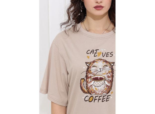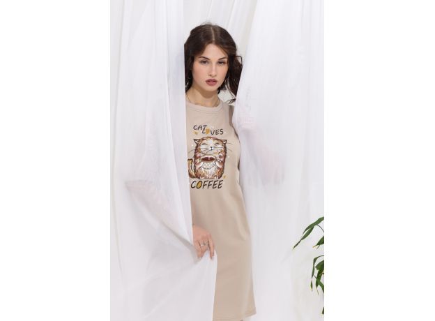Туника свободного кроя с широкими рукавами. Фасон подходит для всех типов фигуры. Горловина округлой формы обработана втачной планкой. Длина рукава указана от основания шеи. Эта туника может использоваться в качестве ночной сорочки. Оригинальный принт-весёлый добрый кот.