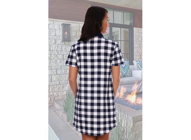 Туника женская в клетку с коротким рукавом, накладными карманами, застежкой по переду и воротником.