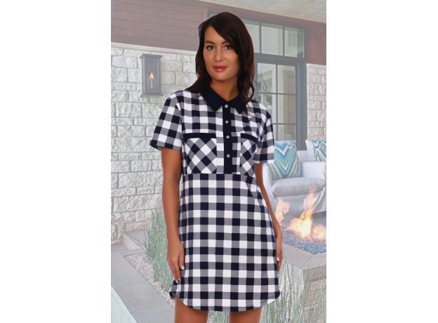 Туника женская в клетку с коротким рукавом, накладными карманами, застежкой по переду и воротником.