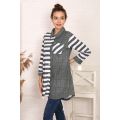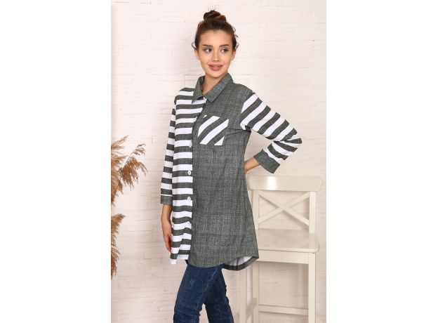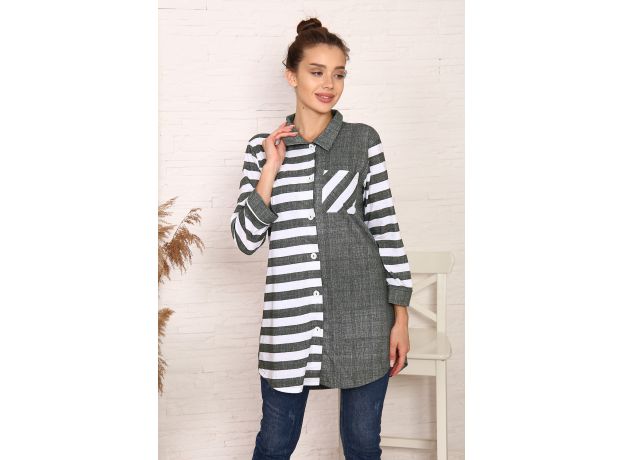 Женская туника-рубашка на пуговицах выполнена из хлопкового трикотажного полотна. Изделие свободного покроя с оригинальным комбинированием прекрасно подойдет для любителей комфорта в стильных вещах.