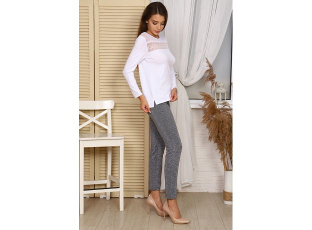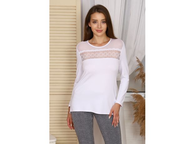 Модель полуприлегающего силуэта длиной до линии бедер, рукав прямой длинный. Перед украшен кокеткой из сетки и кружева, в боковых швах разрезы. Низ переда короче спинки примерно на 3 см. Изделие изготовлено из вискозы, очень комфортной и универсальной в любое время года, а модель - стильная и актуальная, будете носить с удовольствием