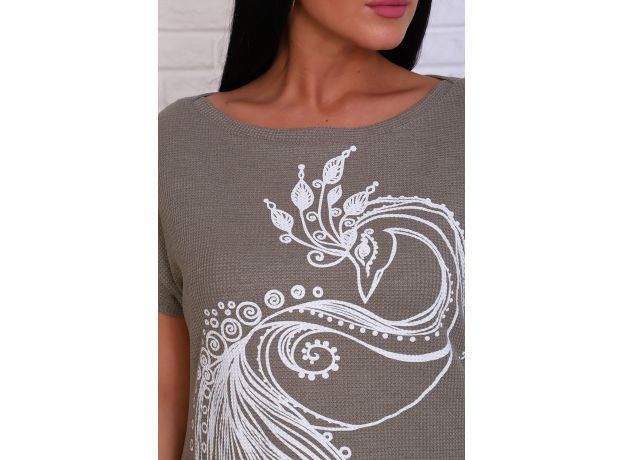 Туника женская с нежным принтом в виде жар-птицы, из трикотажного полотна СОТЫ. Модель полуприталенного силуэта, горловина в виде лодочки обработана обтачкой, спущенная пройма на широком манжете, в боковых швах удобные карманы. Низ спинки удлинён, по бокам небольшие разрезы. Трикотаж СОТЫ имеет оригинальный рисунок, образованный переплетением волокон, внешне напоминает пчелиные соты. Полотно мягкое, эластичное и прочное, легко стирается, практически не мнётся, не деформируется.