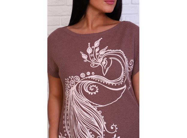 Туника женская с нежным принтом в виде жар-птицы, из трикотажного полотна СОТЫ. Модель полуприталенного силуэта, горловина в виде лодочки обработана обтачкой, спущенная пройма на широком манжете, в боковых швах удобные карманы. Низ спинки удлинён, по бокам небольшие разрезы. Трикотаж СОТЫ имеет оригинальный рисунок, образованный переплетением волокон, внешне напоминает пчелиные соты. Полотно мягкое, эластичное и прочное, легко стирается, практически не мнётся, не деформируется.