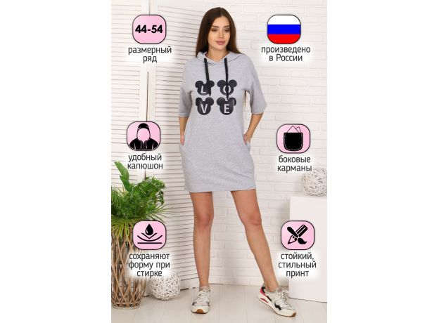 Туника с молодёжным принтом из тонкого, приятного к телу футера 2-х нитки с лайкрой. Модель с капюшоном, спущенная пройма, короткий свободный рукав, в боковых швах удобные карманы. Принт на передней полочке гармонично сочетается с декоративным шнуром в капюшоне. Туника - это универсальная вещь, которая должна быть в гардеробе каждой женщины, независимо от возраста и фигуры.