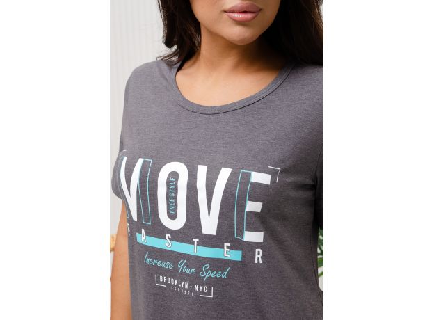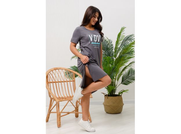 Туника женская из кулирного полотна, прямой силуэт, горловина круглая, рукав короткий, втачной, в боковых швах внутренние карманы, сбоку разрез, низ изделия обработан на плоскошовной машине, на полочке принт. Легкая в уходе.