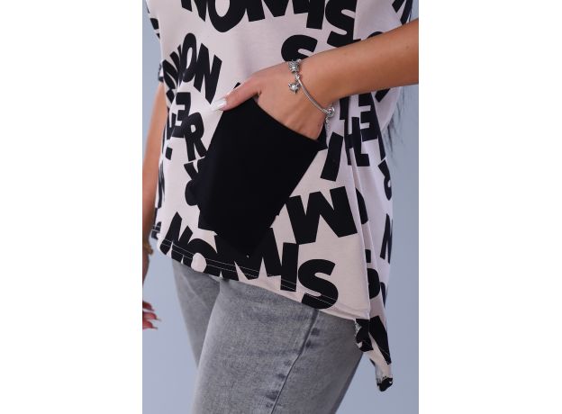 Туника из футера с лайкрой свободного силуэта, расклешенная к низу, с боковым накладным карманом. Низ изделия имеет фигурную форму. Рукав длиной 3/4, ниже локтя.