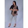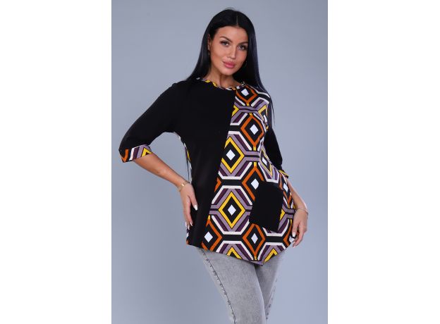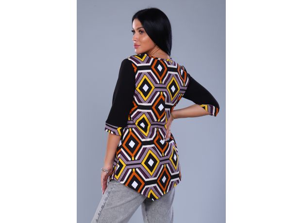 Туника из футера с лайкрой прилегающего силуэта, расклешенная к низу. Низ изделия имеет фигурную форму. Рукав длиной 3/4, ниже локтя.