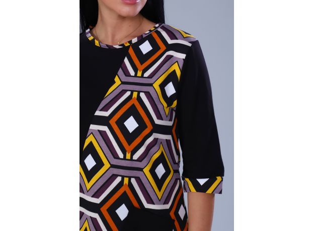 Туника из футера с лайкрой прилегающего силуэта, расклешенная к низу. Низ изделия имеет фигурную форму. Рукав длиной 3/4, ниже локтя.