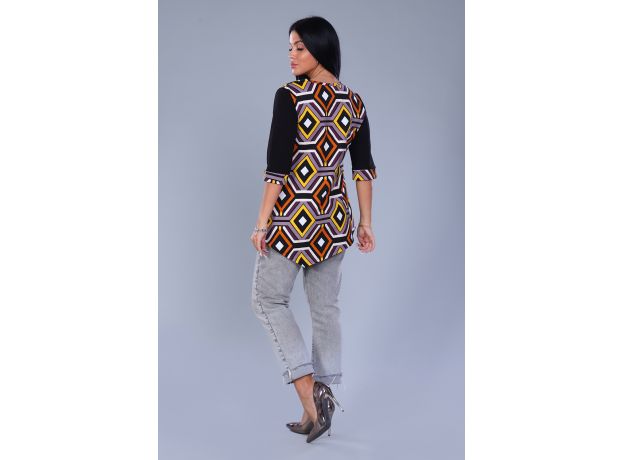 Туника из футера с лайкрой прилегающего силуэта, расклешенная к низу. Низ изделия имеет фигурную форму. Рукав длиной 3/4, ниже локтя.