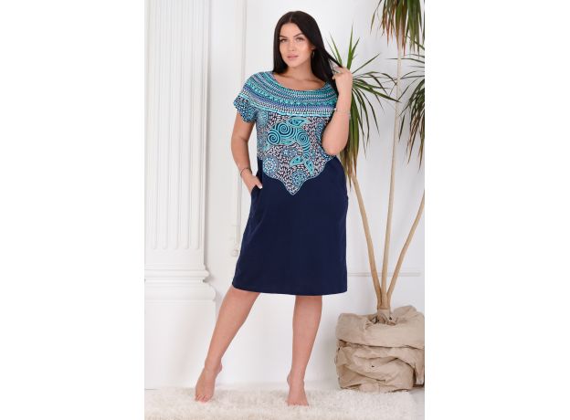 Изделие выполнено из трикотажной хлопчатобумажной ткани. Туника с удобным спущенным рукавом, который подчеркивает линию плеч, имеет прямой силуэт. Полочку украшает яркая печать, переходящая на рукав. У туники имеются боковые карманы, выполненные в швах.